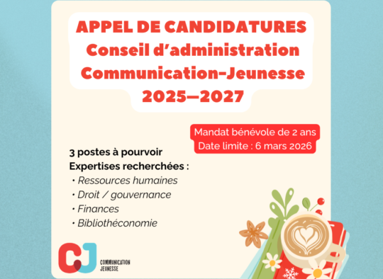 Communication-Jeunesse ouvre les candidatures pour son conseil d’administration 2025-2027. Depuis 1971, CJ œuvre à faire connaître…