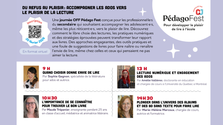 Cette conférence présentera une série d’activités concrètes, expérimentées au secondaire avec des élèves de différents paliers. Les participant·e·s découvriront la lecture en groupe pour le plaisir à partir de différentes collections, l’importance d’offrir des choix, le cercle de lecture sous forme de combat des livres ou de débat, l’utilisation du livre audio, ainsi que les albums de fiction pour travailler l’interprétation et l’appréciation. Les albums documentaires seront également explorés comme outils pour mieux se connaître et comprendre sa société. Enfin, la lecture de poésie sera abordée comme moyen d’enrichir l’expérience littéraire des adolescent·e·s.