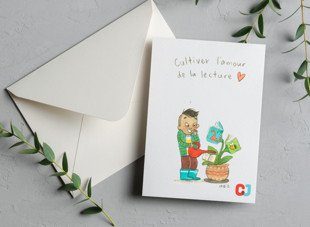 Dans les jours suivant votre don, vous recevrez en guise de remerciement une carte virtuelle à télécharger et imprimer. Un petit cadeau que vous pourriez offrir à une personne qui, à sa façon, cultive le plaisir de lire chez les jeunes : un·e enseignant·e·s, un·e bibliothécaire, un·e libraire ou un·e proche qui s’implique auprès des enfants.