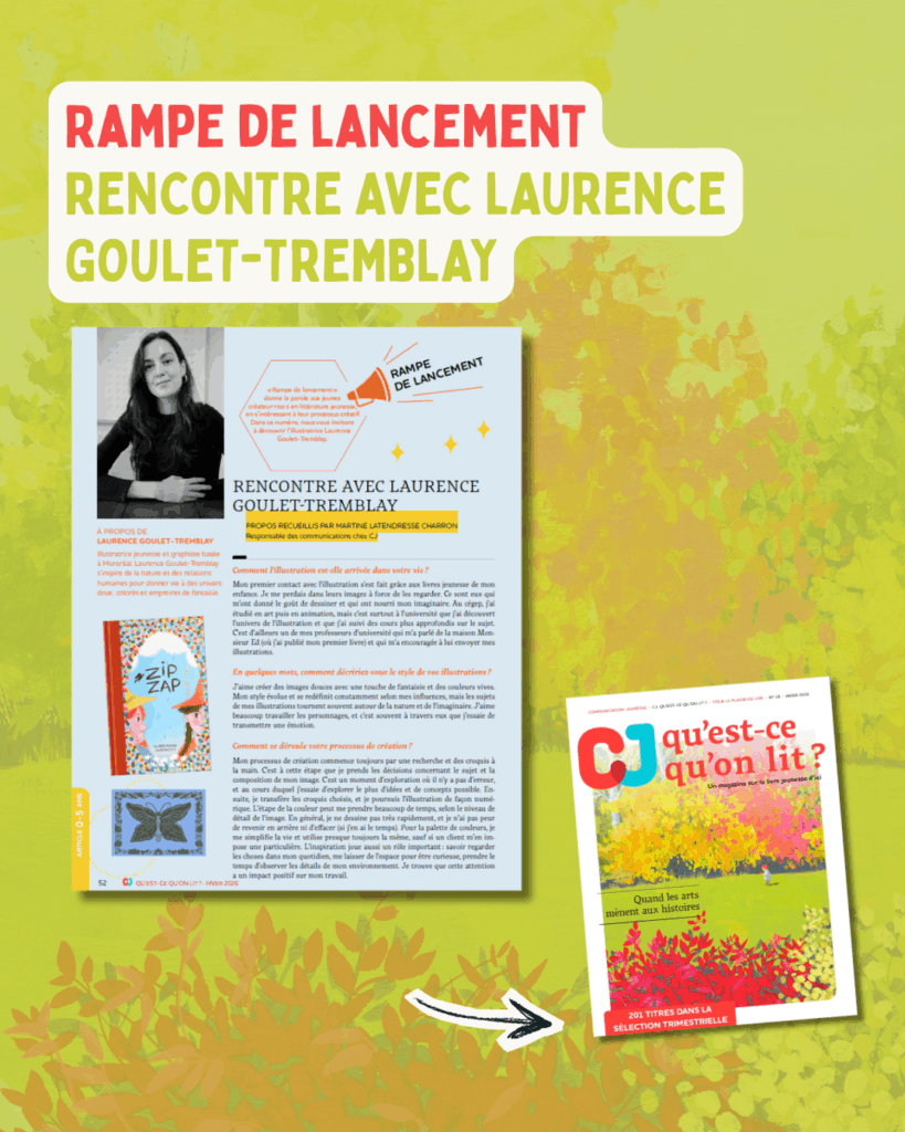 · Le questionnaire Rampe de lancement avec l’illustratrice Laurence Goulet-Tremblay.